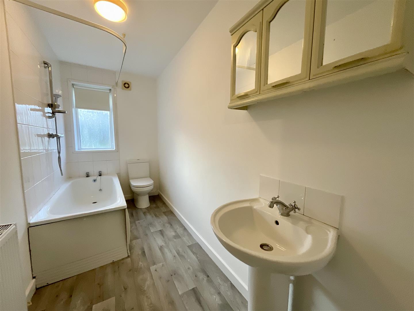A white three piece suite comprising of bath with shower over, low level W.C., pedestal wash hand basin, smooth ceiling, part tiled walls, vinyl floor, extractor fan, uPVC double glazed window to rear.