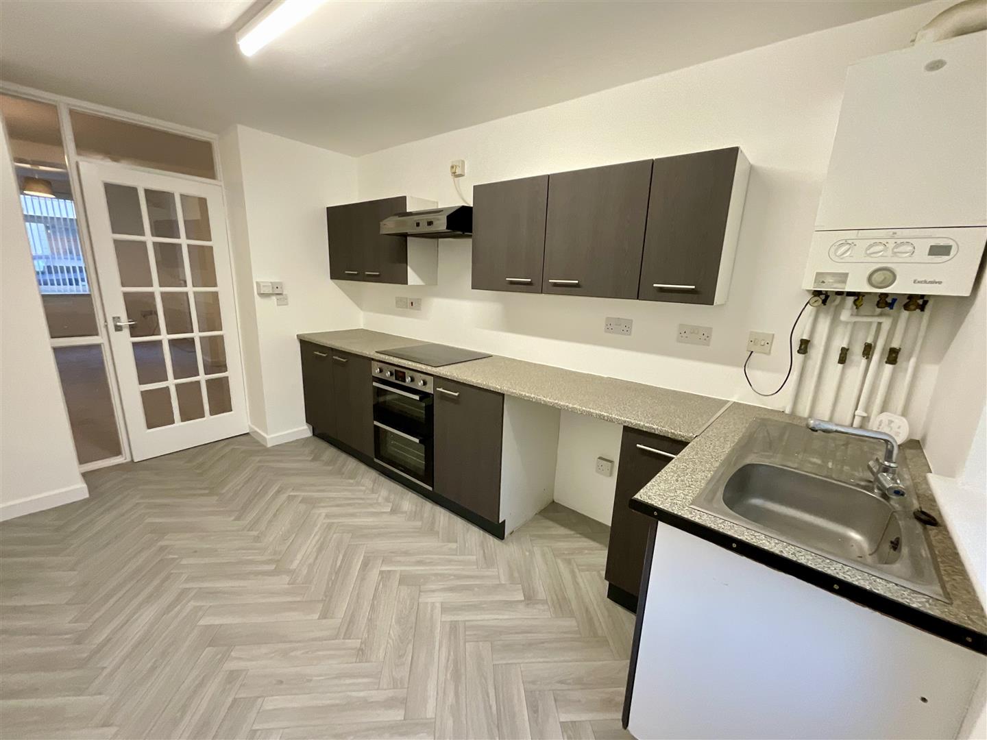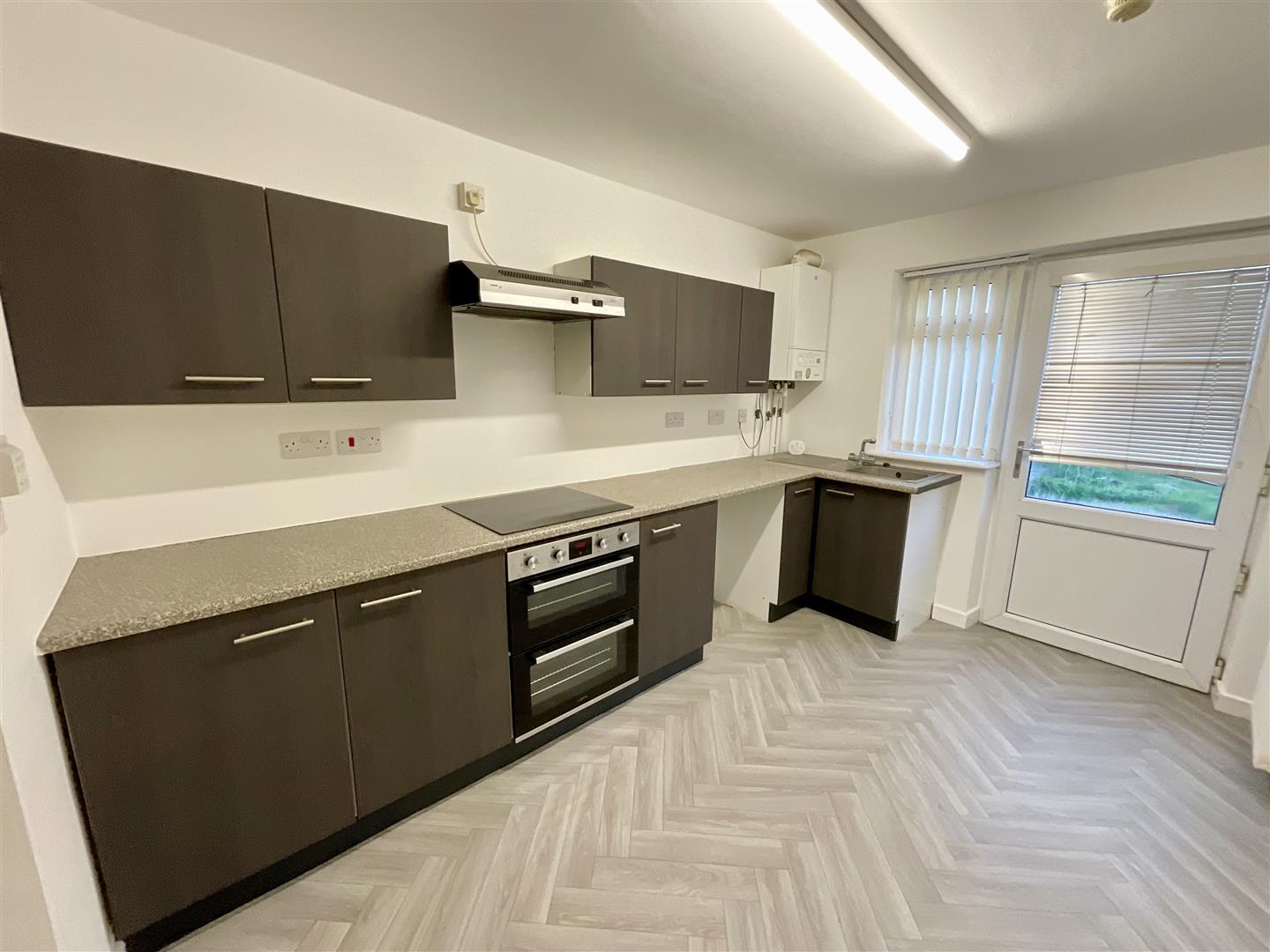A fitted kitchen comprising of matching wall and base units with work surface over, smooth ceiling, stainless steel sink unit with mixer tap, grey vinyl floor, four ring induction hob with extractor fan over, electric oven, wall mounted boiler, plumbing for washing machine, space for fridge freezer, uPVC double glazed window to rear, uPVC double glazed entrance door to rear garden.