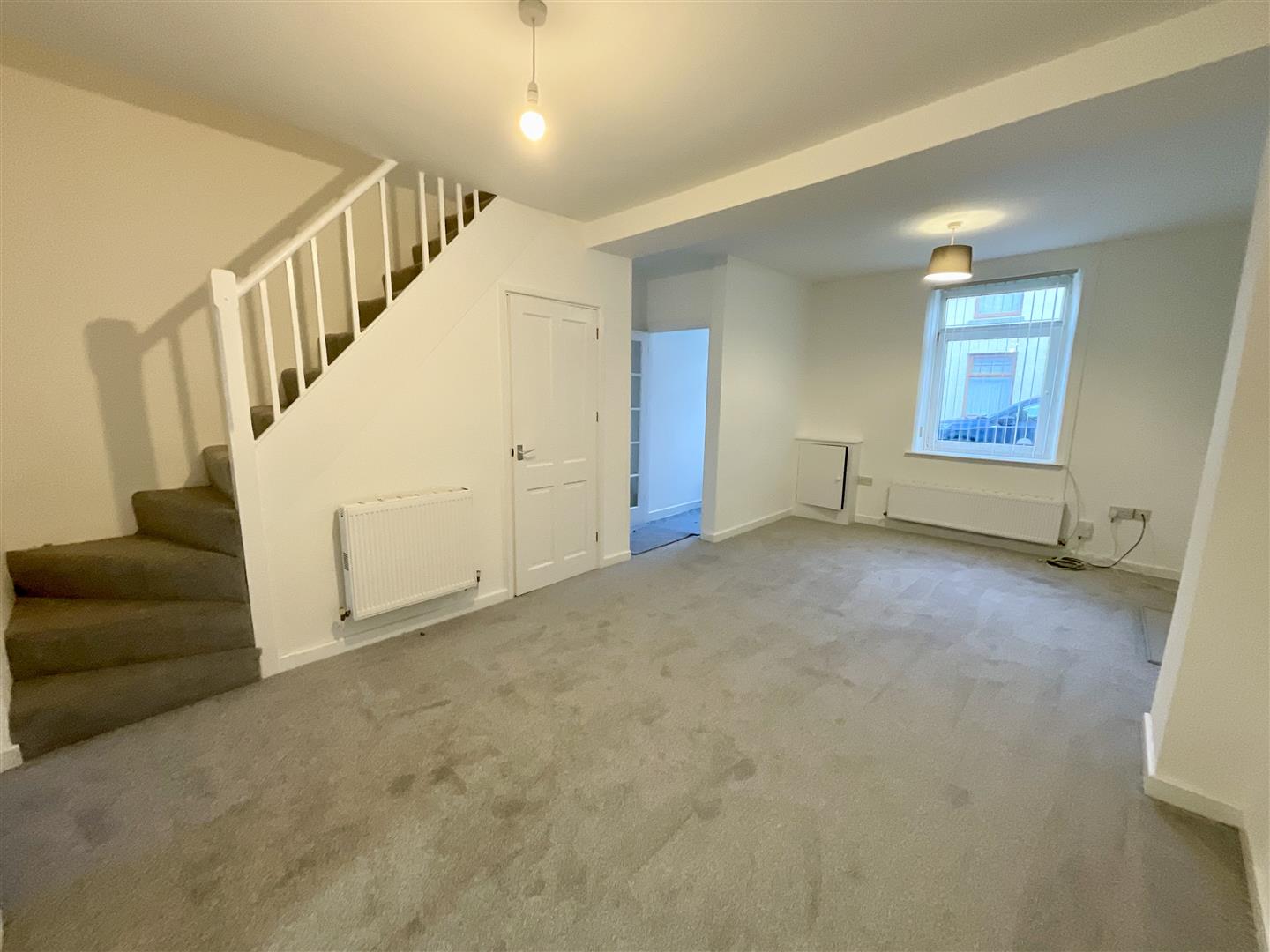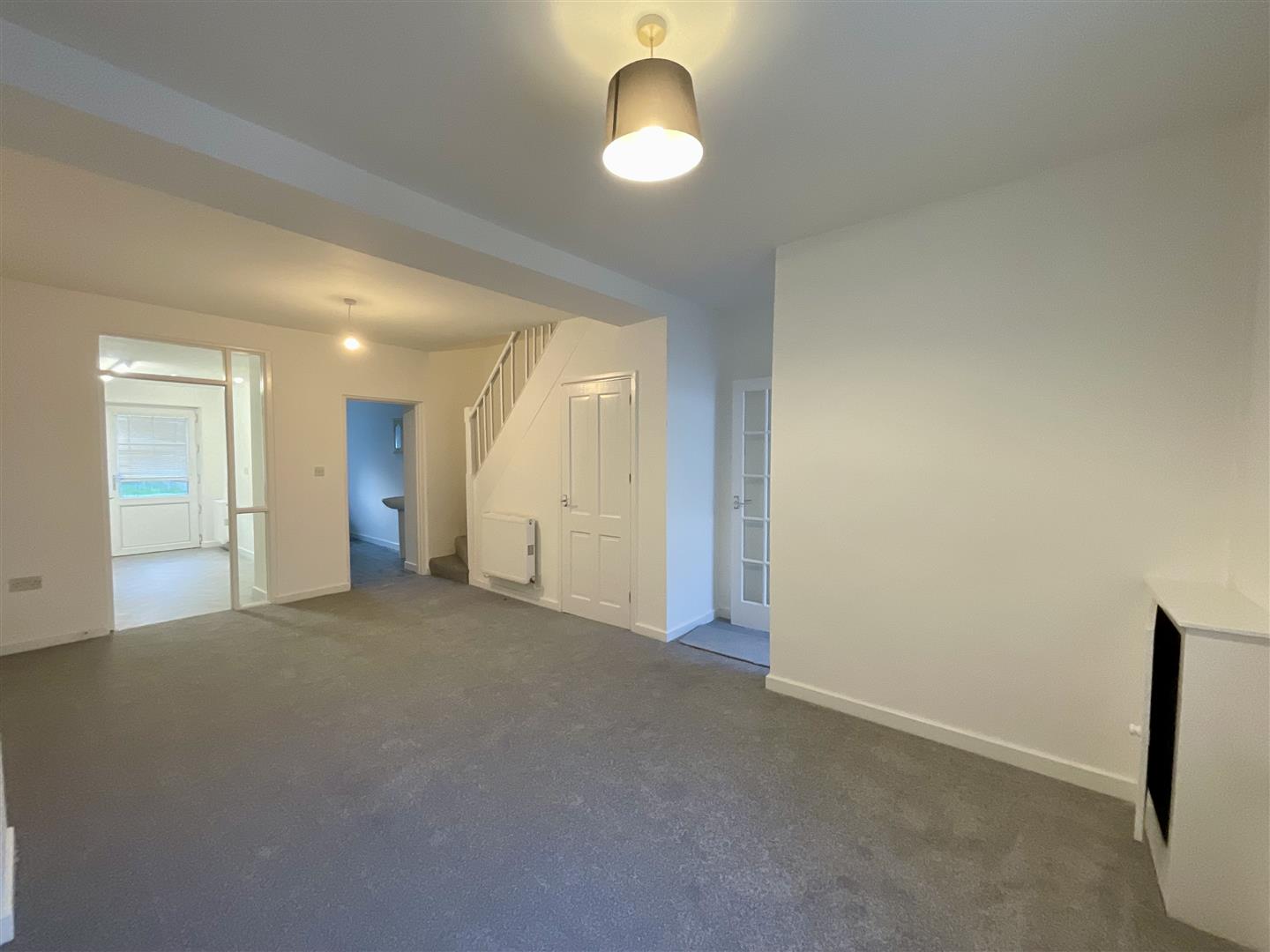 Smooth ceiling, under stairs storage cupboard, two radiators, stairs to first floor, storage cupboard with shelving, uPVC double glazed window to front.